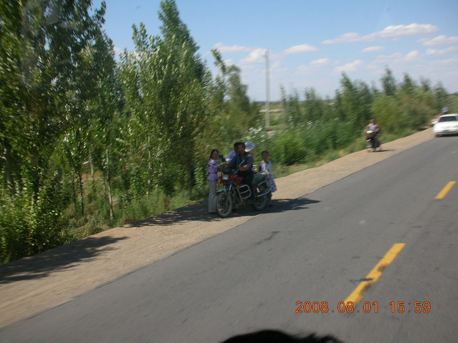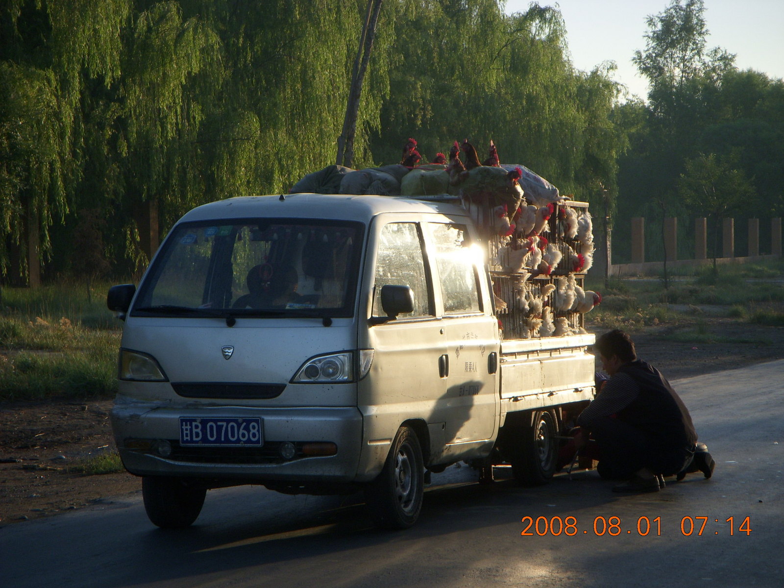2008 August 3, Sunday, 6l3-s8i.jpg * eclipse - Jiuquan morning run- chickens and a flat tire