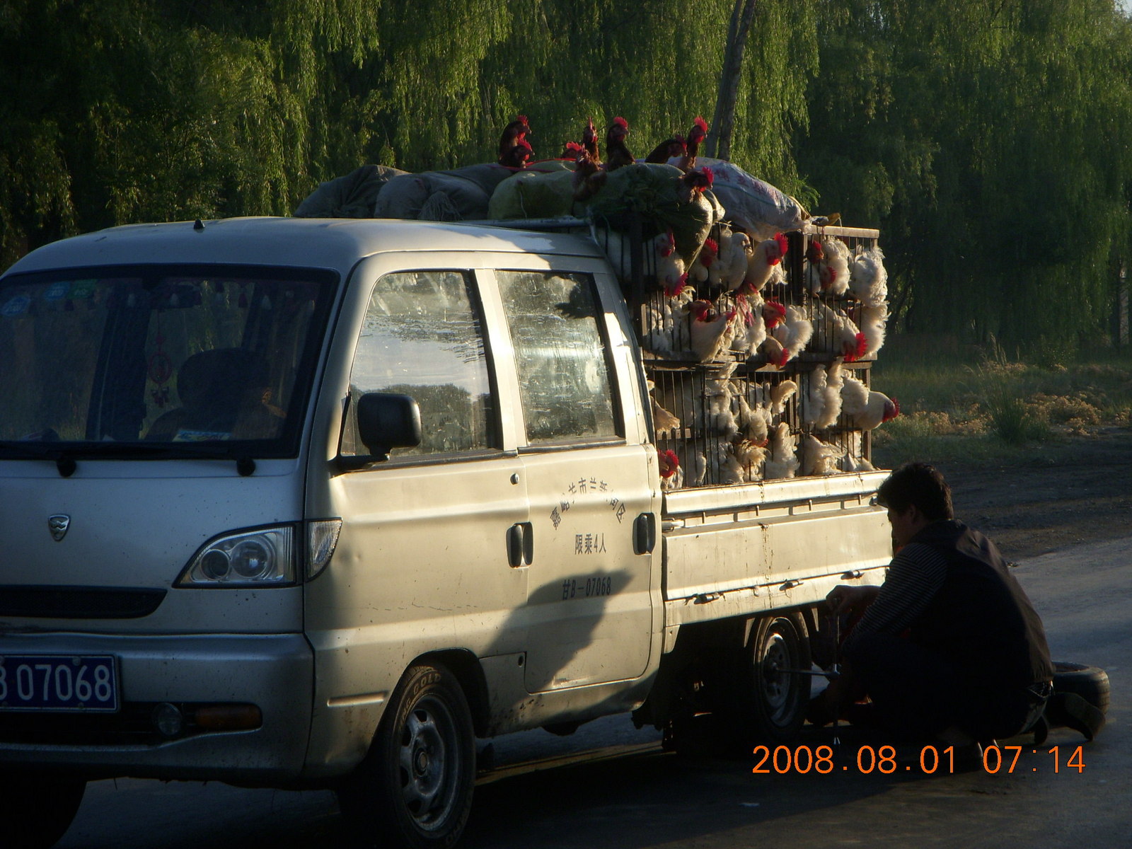 2008 August 3, Sunday, 6l3-s8f.jpg * eclipse - Jiuquan morning run - chickens and a flat tire