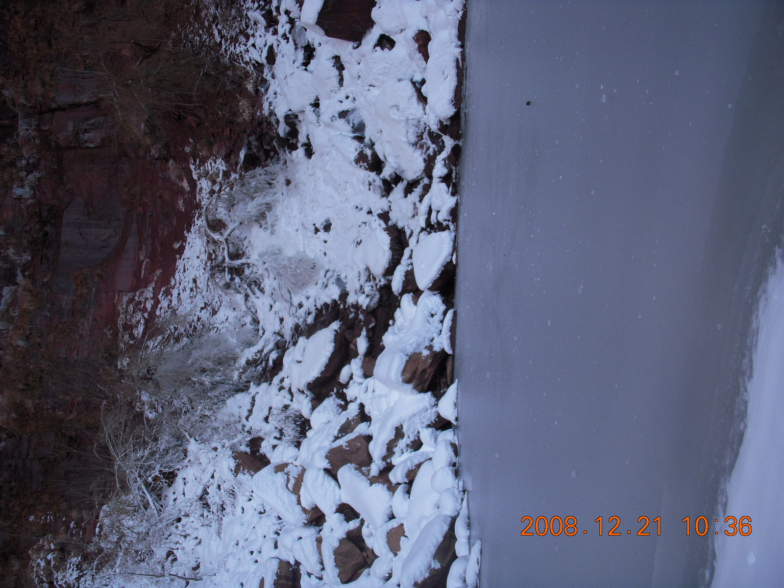 2008 December 21, Sunday, 6qm-v07.jpg * Zion National Park - ripply ice with flash