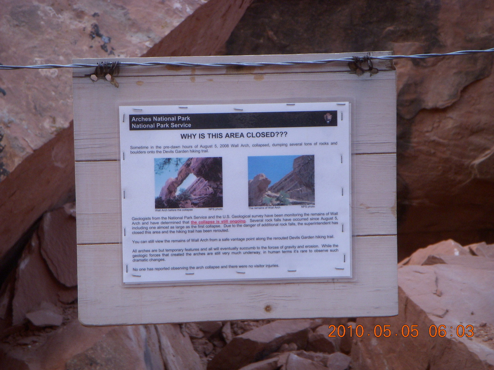 2010 May 6, Thursday, 776-nfd.jpg * Arches National Park - Devil's Garden and Dark Angel hike - Wall Arch sign