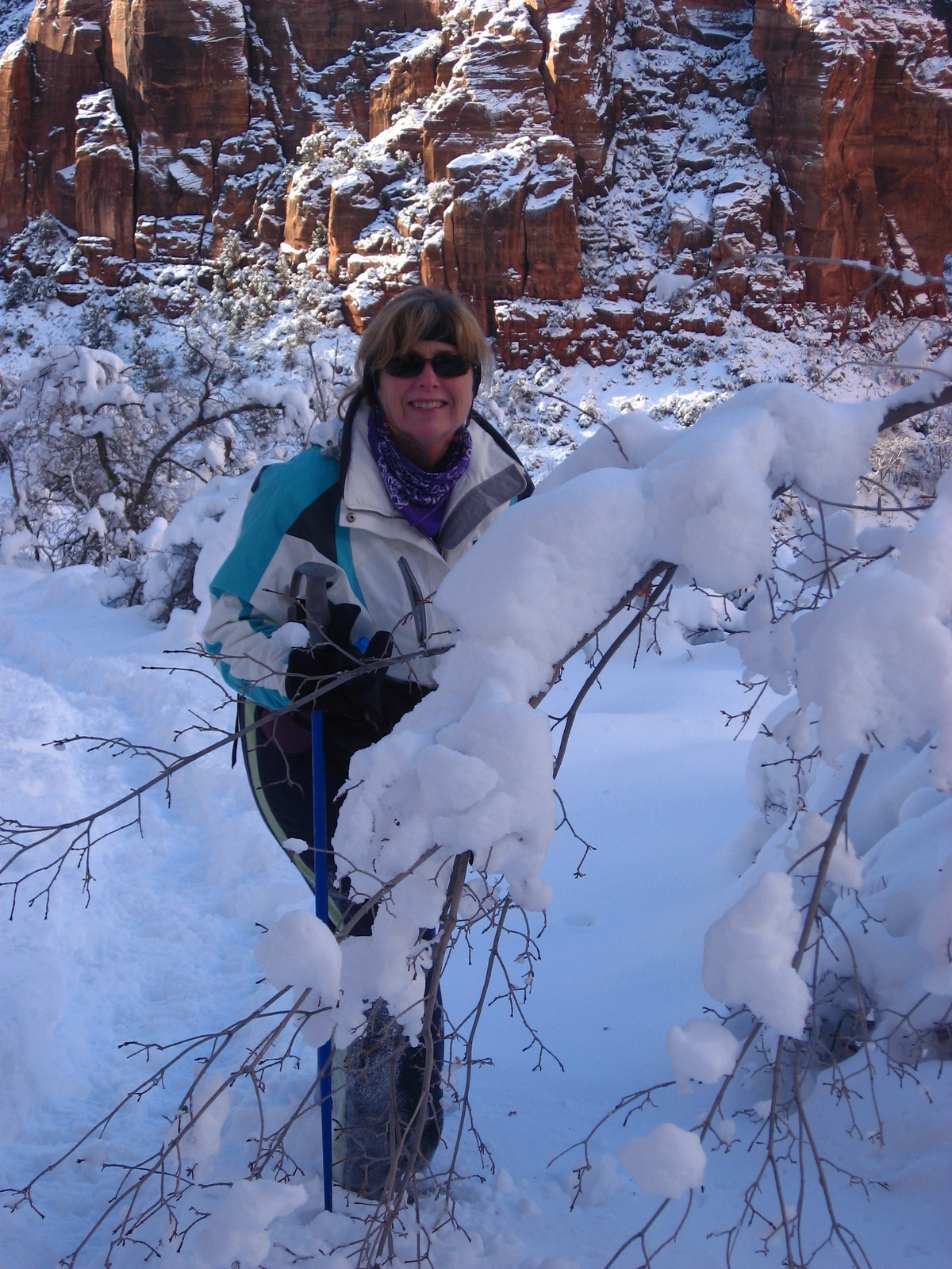2011 January 13, Thursday, 7fd-oli.jpg * Zion National Park trip - Hidden Canyon hike - Sheri behind trees