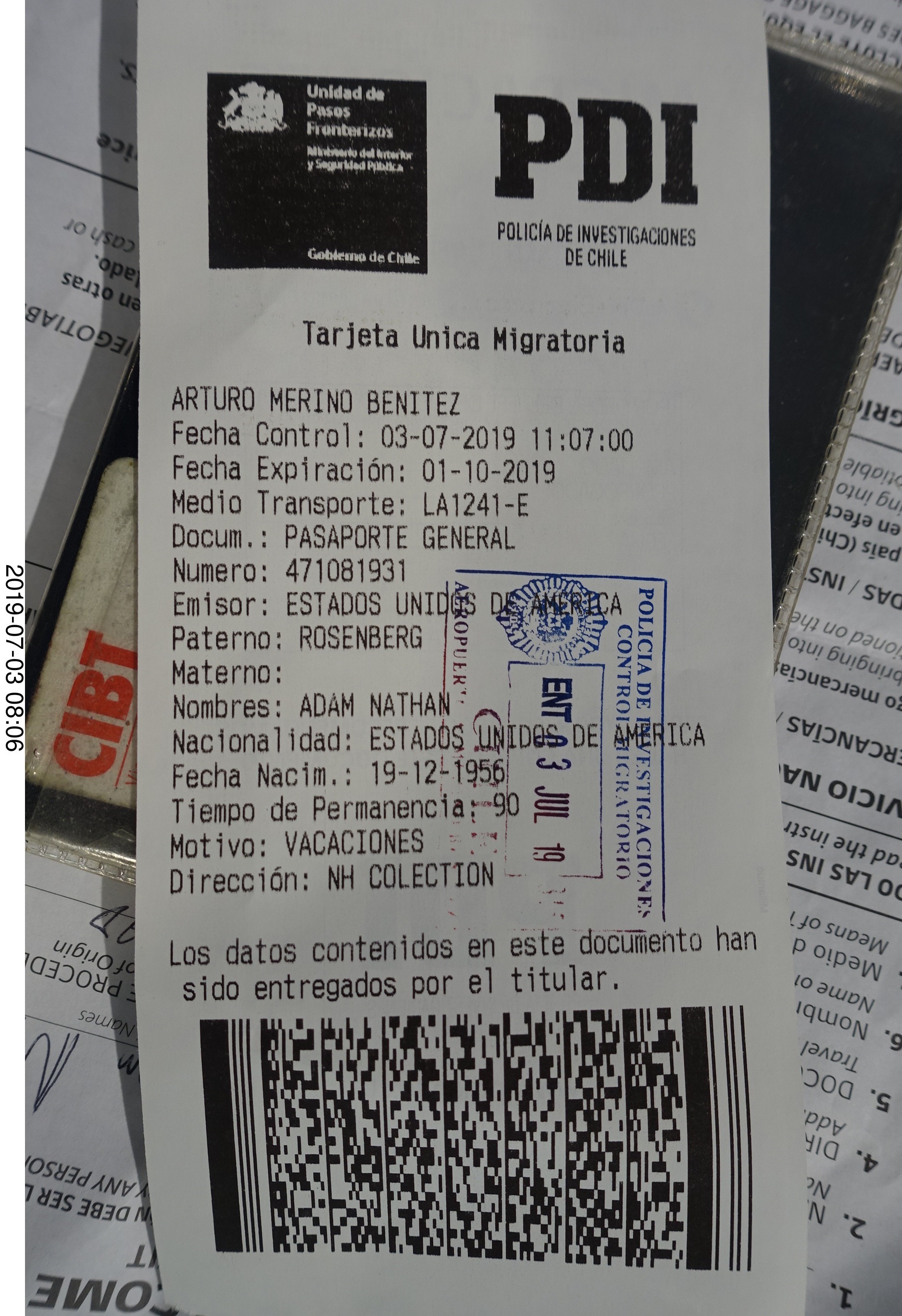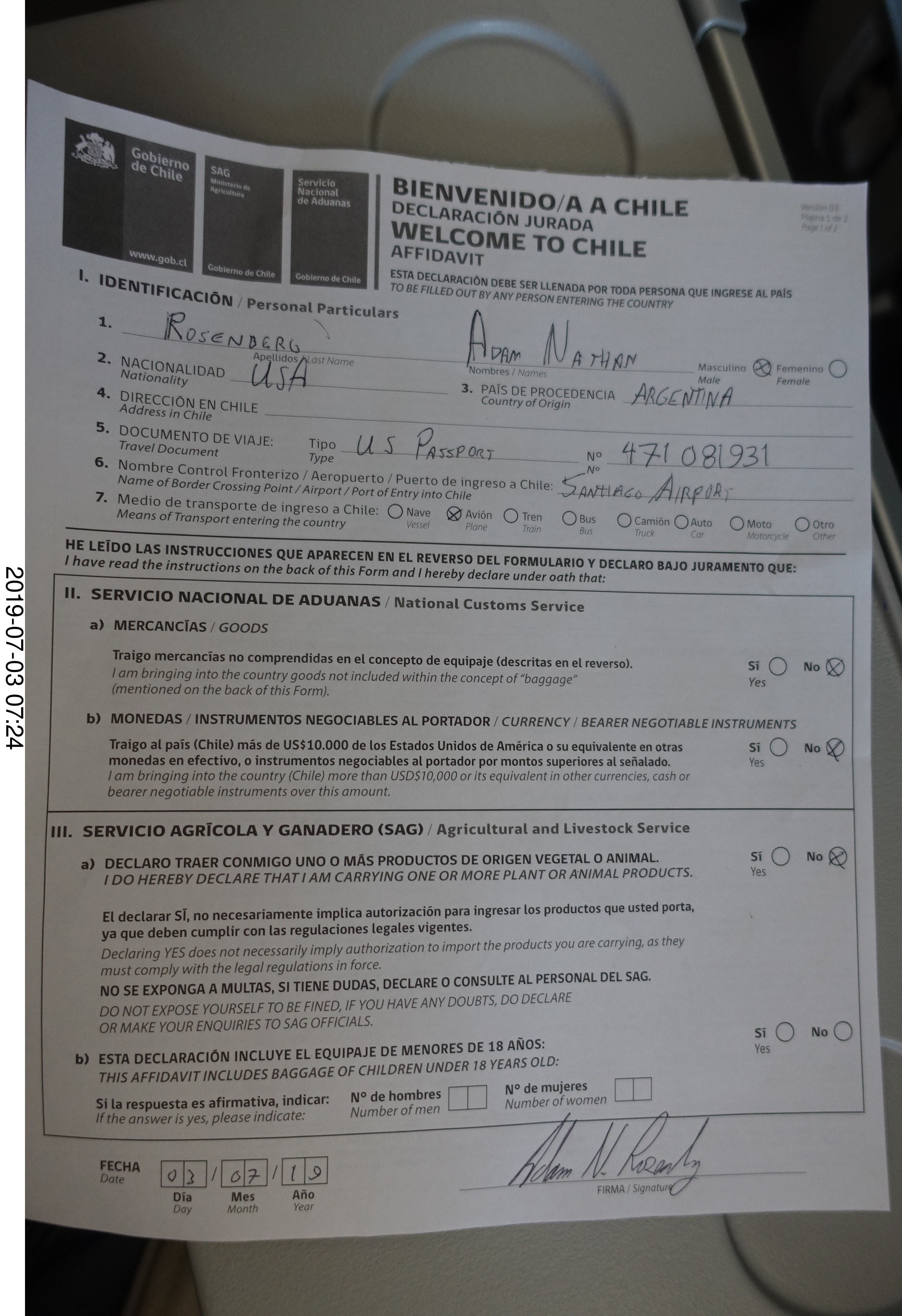 2019 July 3, Wednesday, af3-y1z.jpg * Chile - flight San Juan to Santiago - immigration form