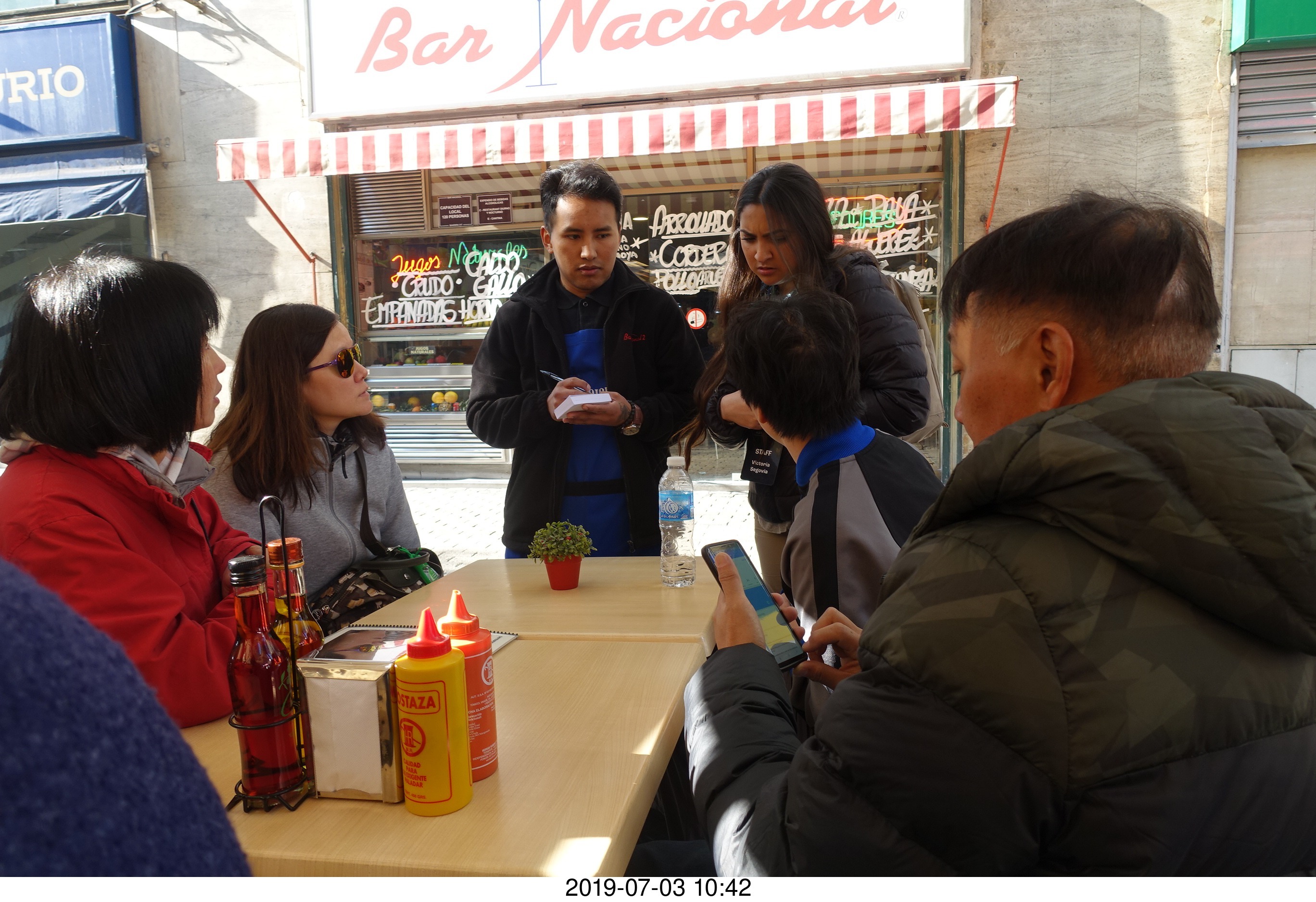 2019 July 3, Wednesday, af3-y3a.jpg * Chile - Santiago tour - restaurant - waiter and tour guide
