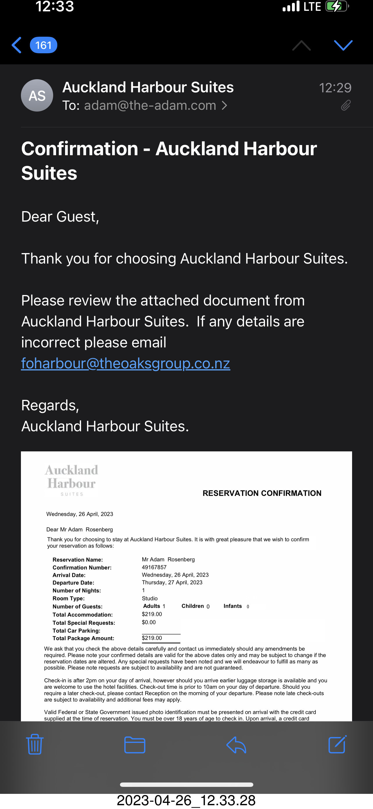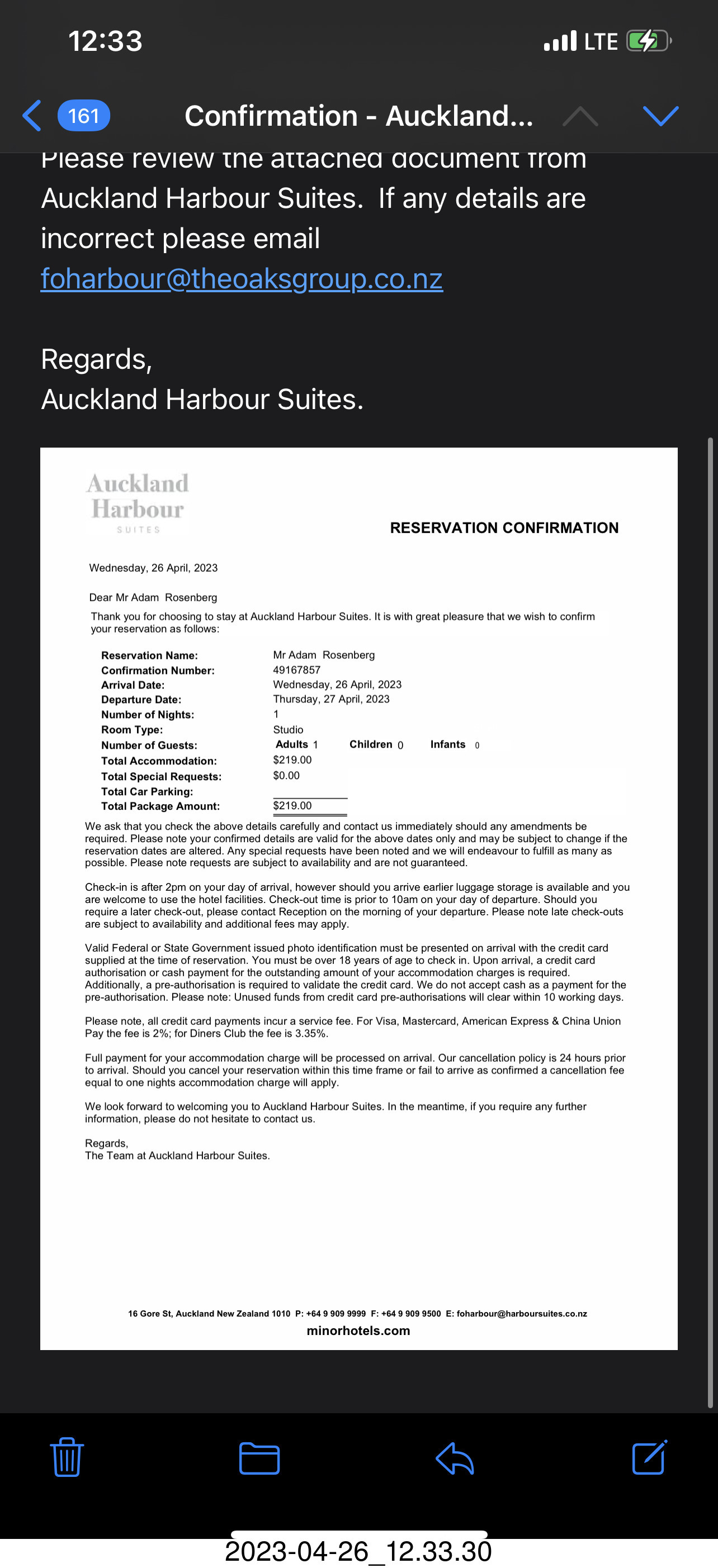 331 a1s. New Zealand - Auckland - hotel confirmation