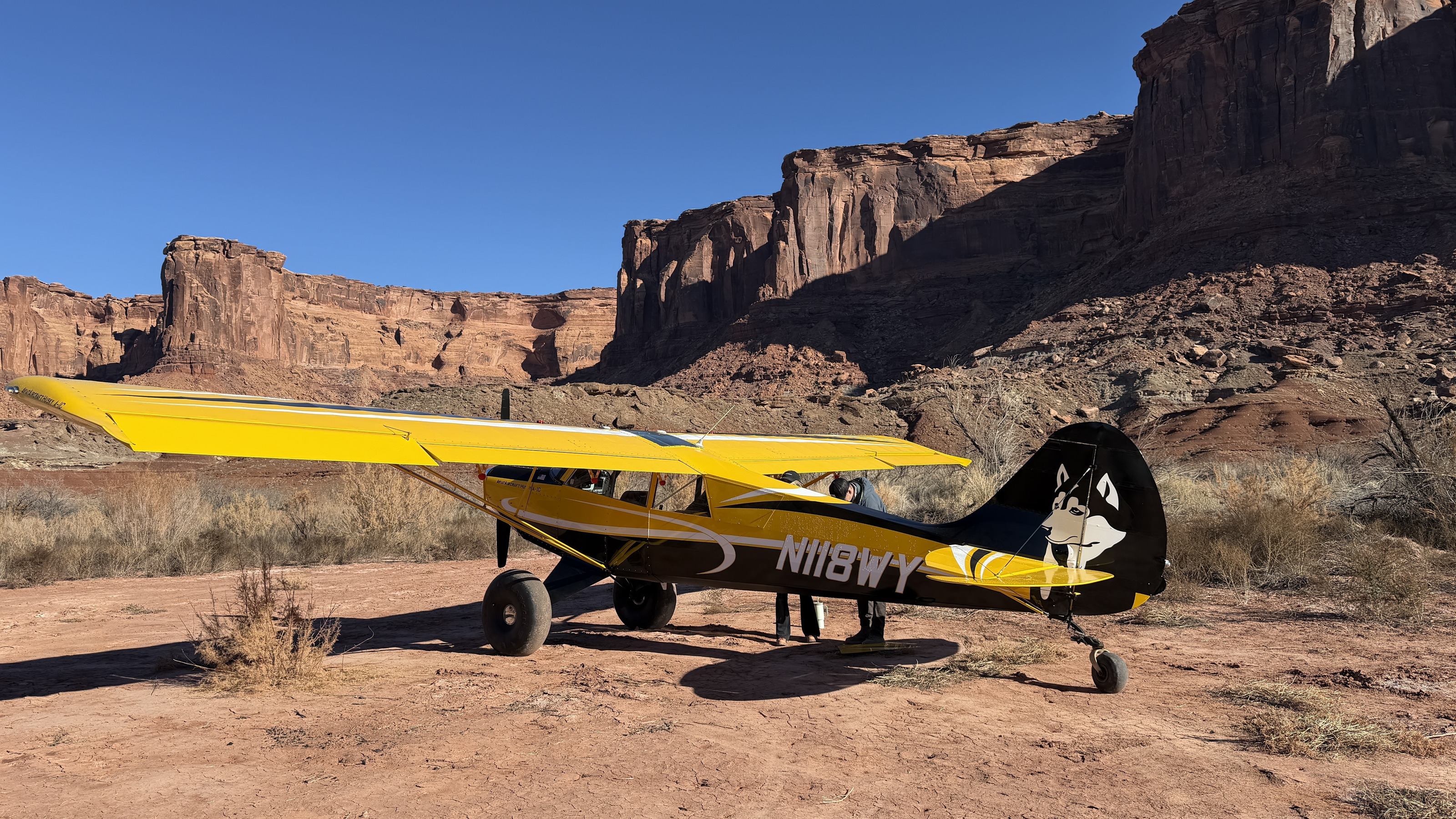 2025 December 13, Saturday, cqd-anf.jpg * Utah - Mineral Canyon airstrip - yellow Husky NII8WY pilots